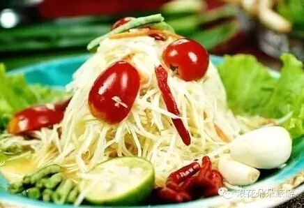 在泰国,选没有熟透的青木瓜做一道沙拉味道与熟透的木瓜相比不仅口感清爽,而且营养更加丰富。泰国人喜欢用它配上糯米饭来吃,而你可以再路边摊或者餐厅找到青木瓜沙拉,品尝一下融合各种调料的东南亚味道。