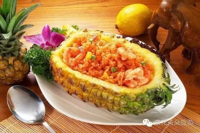 菠萝饭,又叫凤梨饭,营养全面,运用奇香的泰国香米,搭配菠萝以及什锦蔬菜,用大火爆炒,酸甜偏咸的口感,吃一口就令人食欲大开,加上酥脆的腰果,入口之后层次丰富,回味无穷。