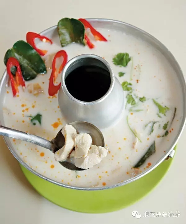 泰国本土名汤,传承了数百年。因为椰奶带甜味,比较腻滞,所以一般泰国菜中,椰奶多用作咖喱菜肴之调味或调色,极少作烹汤用。但这道菜却以椰奶煮汤,放入香茅、鱼露、青柠檬汁、柠檬叶、鸡肉等,吃起来奶香味浓郁。