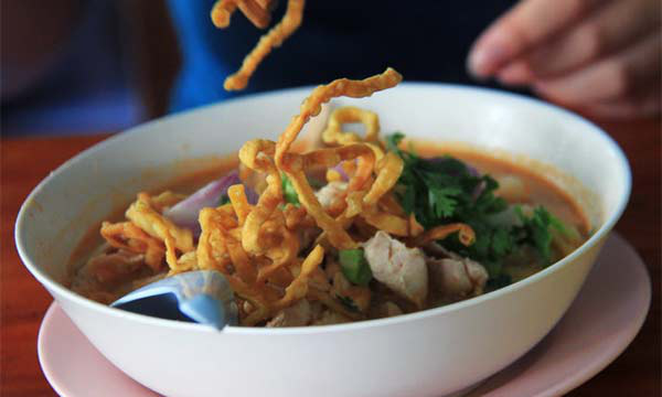 鸡肉咖喱汤鸡蛋面,又被人叫做“清迈面”,所以当然要放在清迈美食第一个来推荐!咖喱汤看着辛辣,其实是清淡口味的,鸡蛋面一部分是煮的,一部分是炸的,口感更丰富。