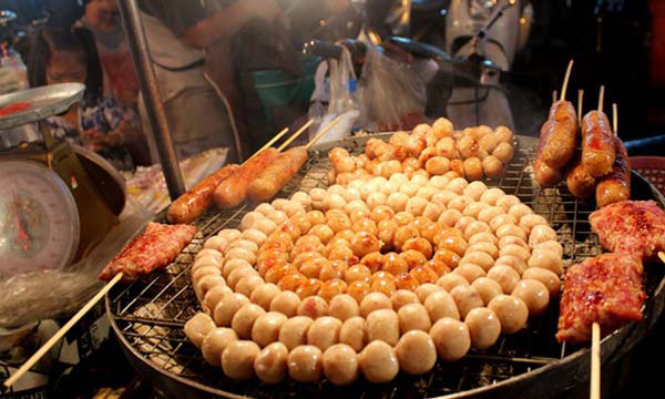 大约傍晚5、6点钟吧,大棚里的摊位关了,街上的路边餐饮摊就陆续登场了。烤串、粉面、家常菜,我和朋友一顿乱买,大约六七种,也才人民币30块多,根本吃不完。