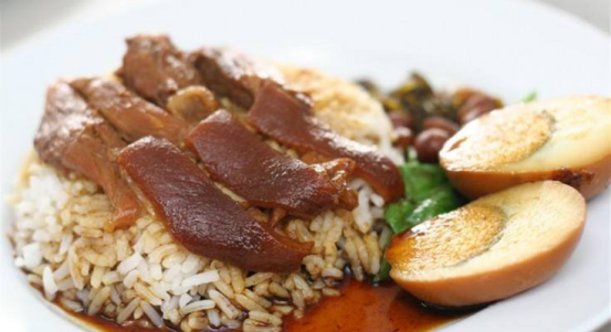 猪脚饭在步行街口边上有一家,味道就不错,炖煮很烂的猪肘肉,猪蹄,和米饭一起,再浇上香浓的肉汤,有的还给卤蛋。味道是咸香微甜的,一份下去总有意犹未尽的感觉,喜欢的话可以再加上些辣椒,全方位的过瘾解馋。