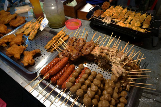 泰国人很喜欢碳烤猪肉,口味有些像新奥尔良,但是更加浓郁一些,碳烤的猪肉肥瘦合适,有些焦香和炭火炙烤的气息。鸡胗串的口感也很弹牙爽脆,用后槽牙咀嚼的时候,会是一种很奇妙的口感,像是在和口齿做游戏,越吃越过瘾。建议看到卖猪肉串和鸡胗串的,付钱时候,多买一倍的量,否则你肯定还会回去再买第二次。