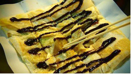 这是个甜品,也能当饭吃,味道没有那么甜。是用蛋液混合切成片的橡胶摊成一张饼,然后里面挤上炼乳和巧克力酱,分切成小块,鸡蛋奶香混合香蕉的香甜,我觉得一份更适合多人吃,因为热量较高还是很占肚子的。